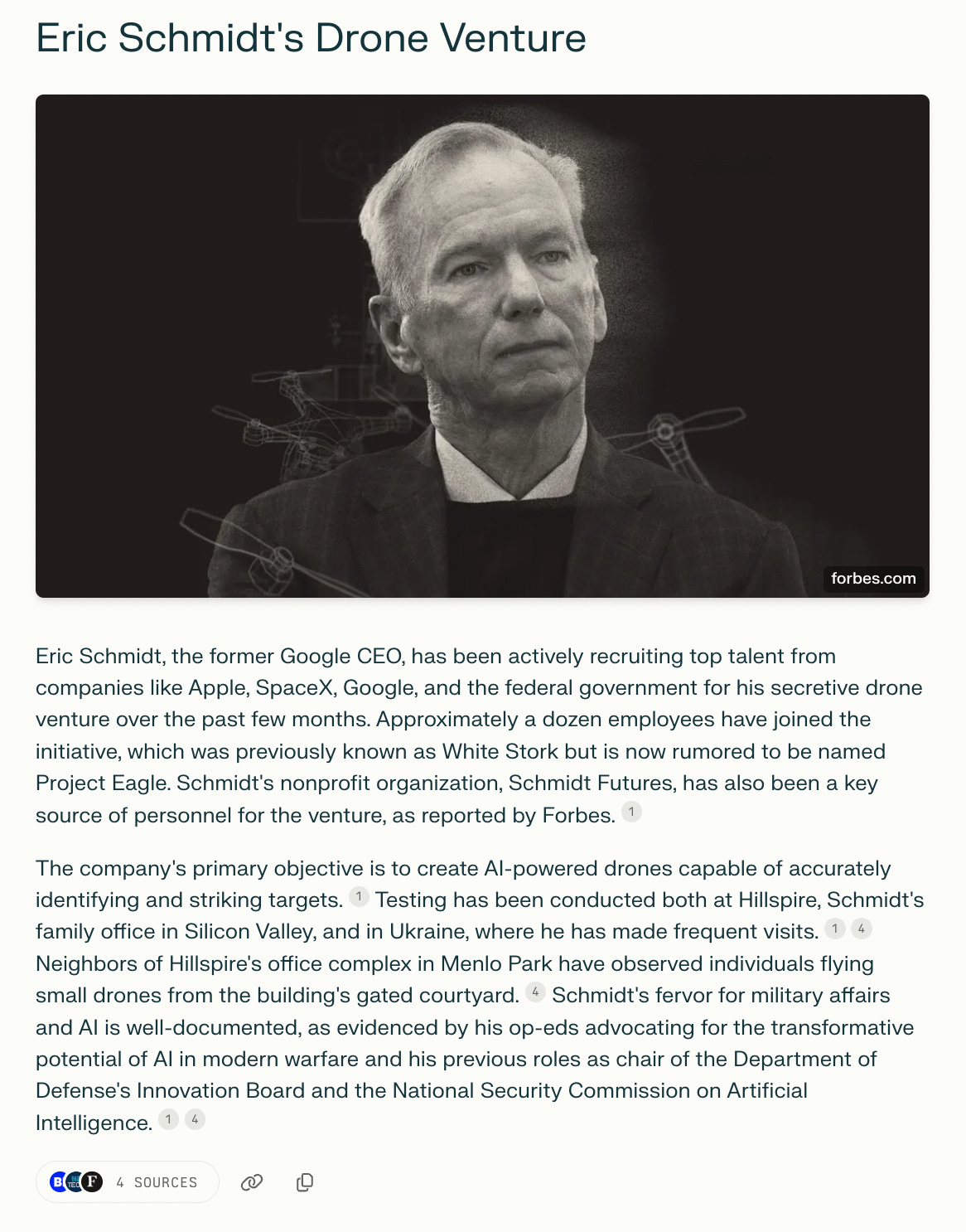 It didn’t take long for the very bad thing to happen. On June 6, Forbes posted a story by Sarah Emerson and Rich Nieva about former Google CEO Eric Schmidt. The two journalists discovered that Schmidt’s secretive company White Stork, reportedly now renamed Project Eagle, was testing military drones in Menlo Park, California, and Ukraine. It was a big scoop, the kind that takes journalists hundreds of hours and dozens of interviews to make happen. It was also behind a pay wall, supposedly out of reach to all non-subscribers.